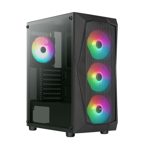 - Chasis: Micro-ATX con panel lateral de vidrio templado y ventiladores ARGB